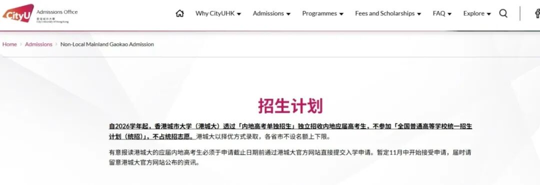 自2026学年起,香港城市大学(港城大)通过「内地高考单独招生」独立招收内地应届高考生,不参加「全国普通高等学校统一招生计划(统招)」,不占统招志愿。港城大以择优方式录取,各省市不设名额上下限。